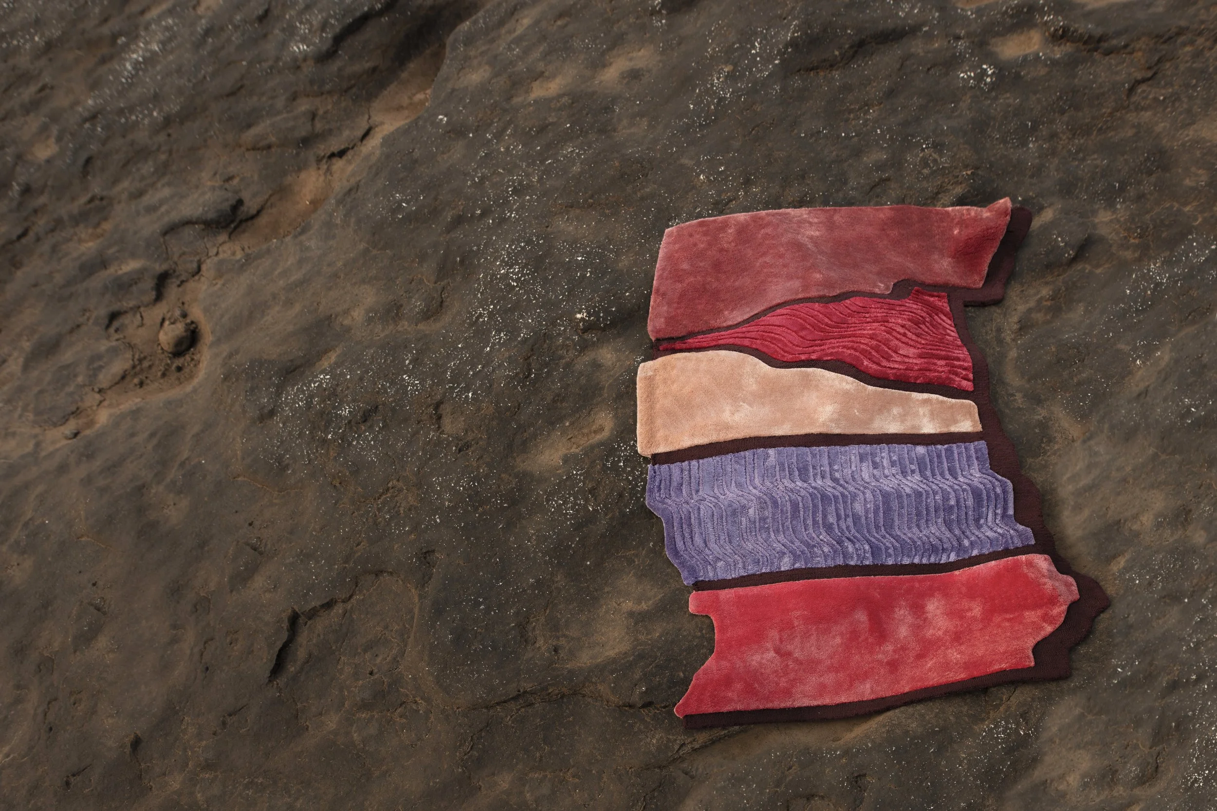 This is a hand-tufted rug featuring a combination of loop and cut pile construction, skillfully crafted to mimic the appearance of "steps". The rug is rendered in an aesthetically pleasing blend of red hues.
